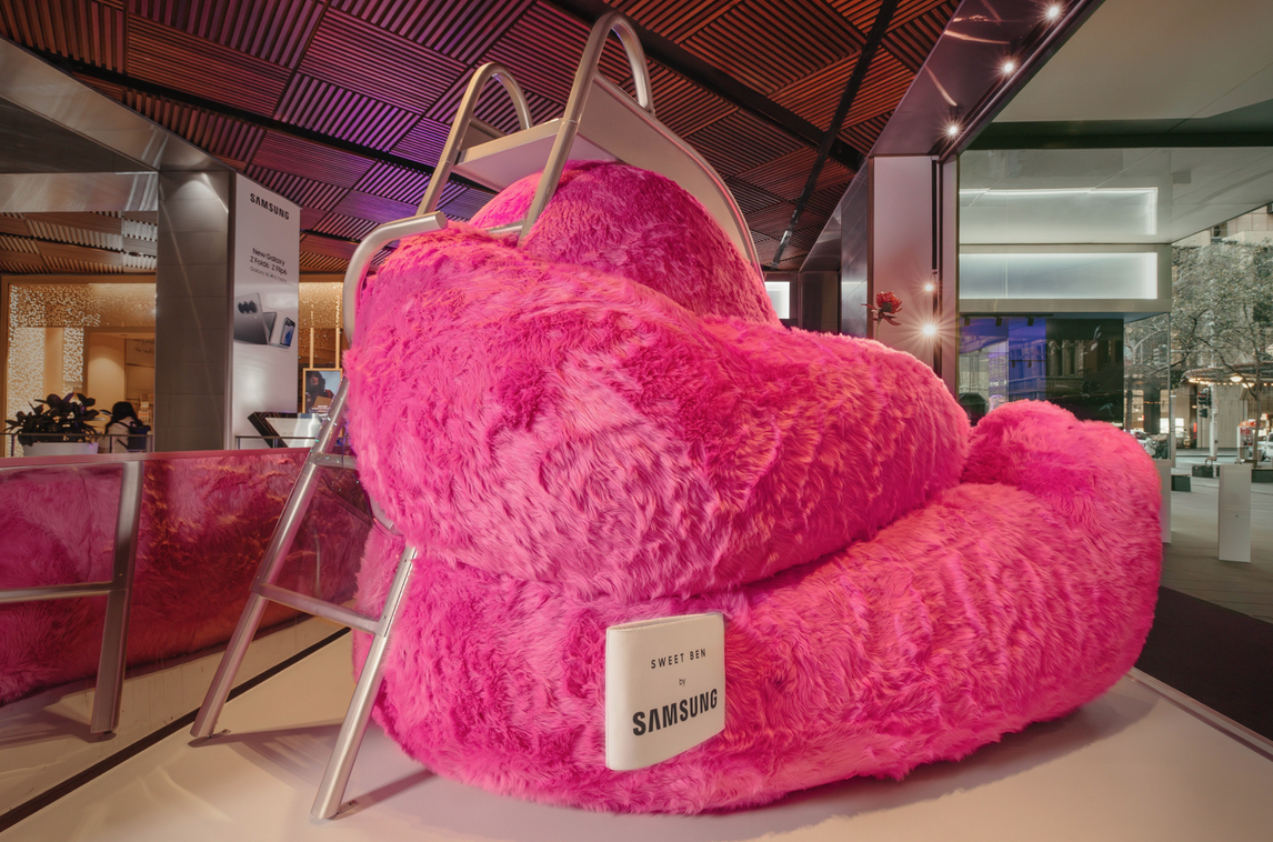 AI is here. But not everyone’s a fan. Which was a bit of a problem, considering Samsung’s new phone was packed with AI features. To change minds, we teamed up with James Dive to create Sweet Ben - A 500kg hot pink giant so adorable, you have to get a selfie with him for the group chat. But his size makes it impossible to take yourself. That’s where Galaxy AI steps in to automatically frame and take the shot for you so everyone fits in. Even the big pink fella.